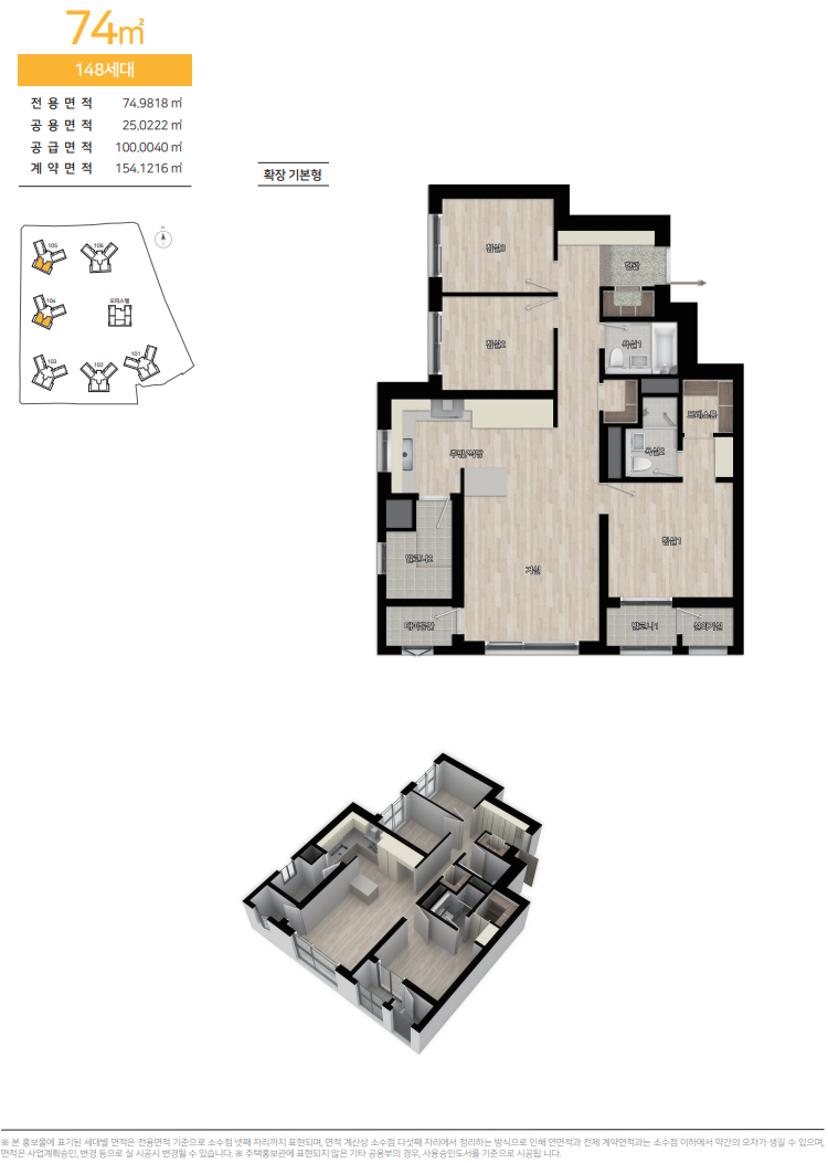 ※ 본 홍보물에 표기된 세대별 면적은 전용면적 기준으로 소수점 넷째 자리까지 표현되며, 면적 계산상 소수점 다섯째 자리에서 정리하는 방식으로 인해 연면적과 전체 계약면적과는 소수점 이하에서 약간의 오차가 생길 수 있으며, 면적은 사업계획승인 변경 등으로 실 시공시 변경될 수 있습니다.